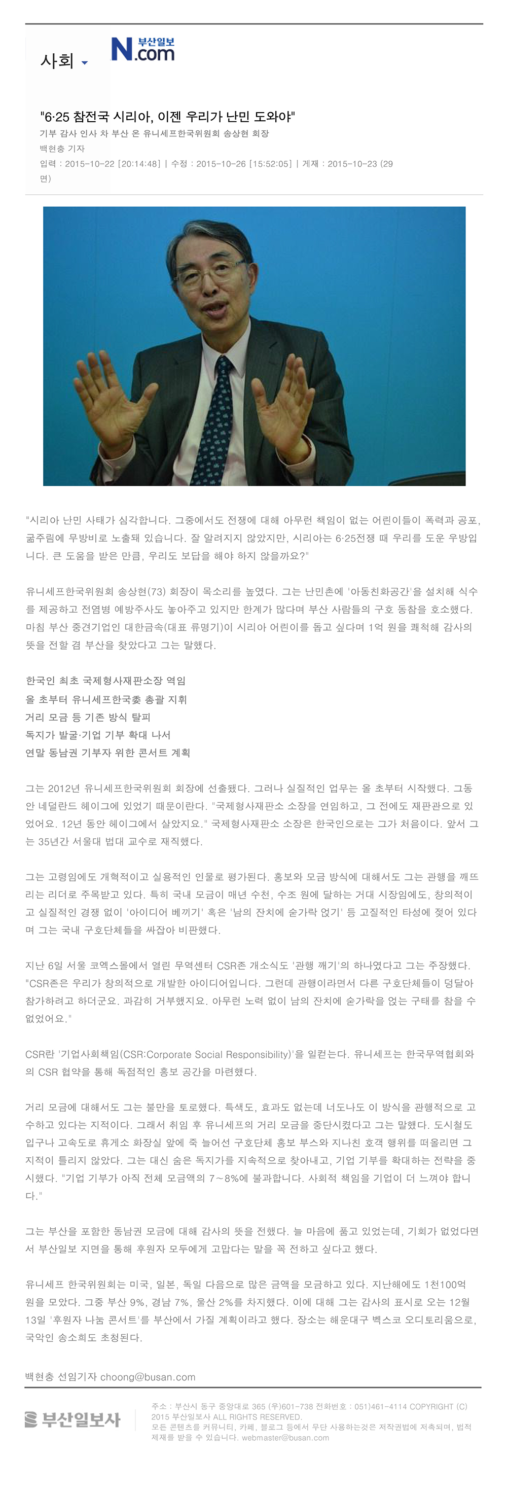 기부감사 인사차 부산 온 유니세프한국위원회장 송상현-부산일보 인터뷰