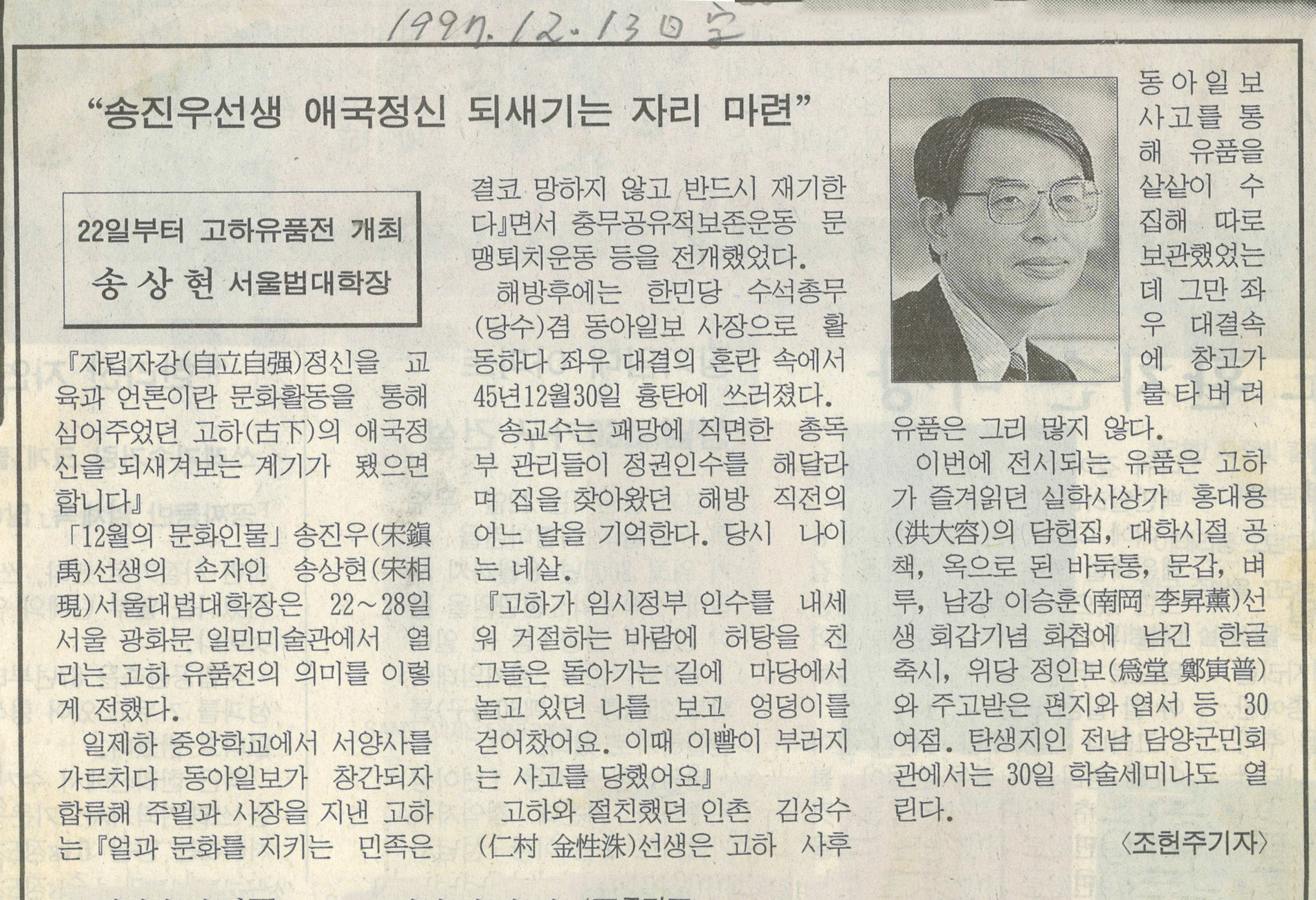 고하송진우선생 유품전 개최 송상현 서울법대학장-동아일보 인터뷰